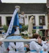 La Vierge occupe bien sûr une large place dans le cortège avec notamment plusieurs statues et des groupes évoquant les mystères du rosaire.